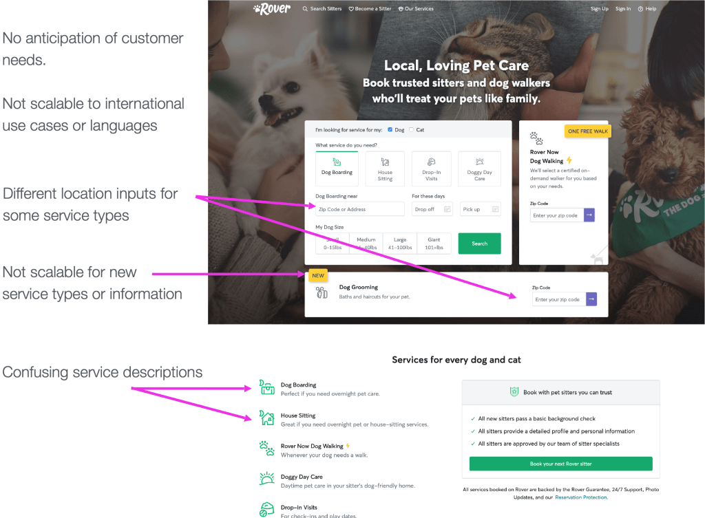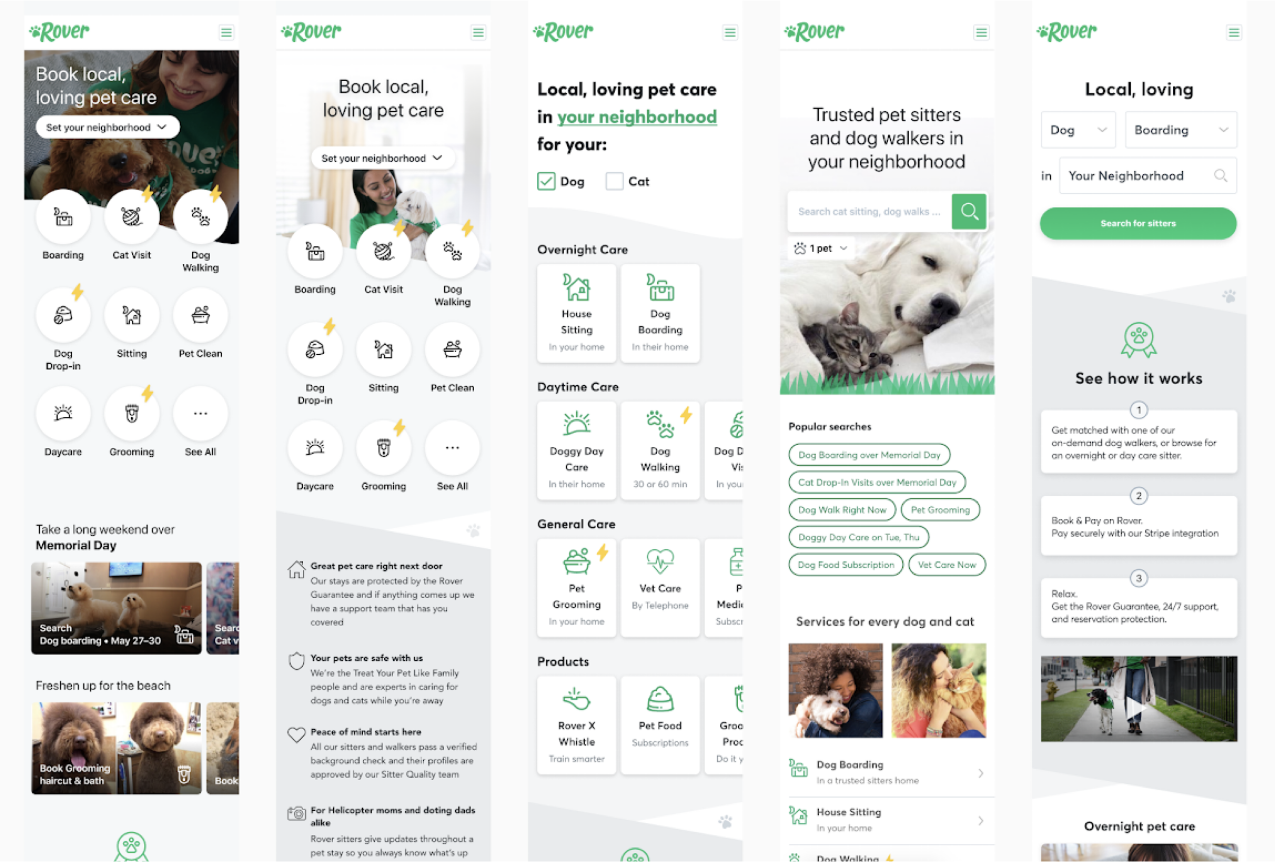 In 2019, my team uncovered user confusion and functionality gaps on the Rover homepage, impeding our ability to convert new users. At the time, we had about 300K users, with services being booked about once every 3 seconds, but our need to continue that growth and attract new users was critical to our ongoing success.