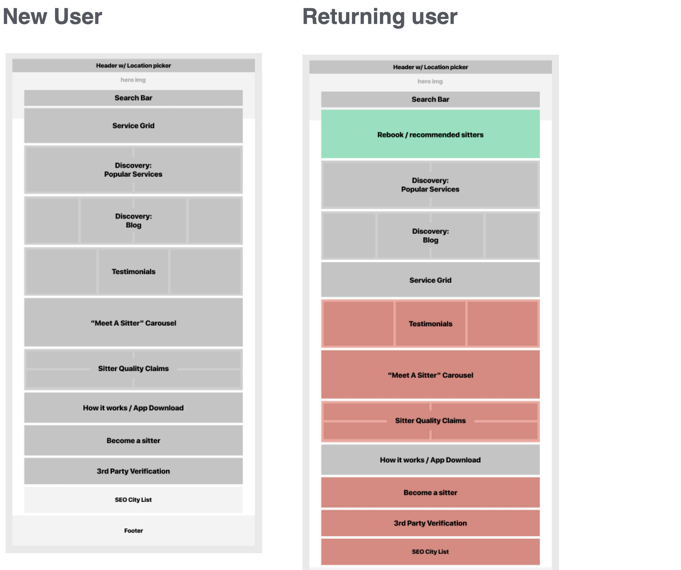 After aligning on which content types were most effective and the best means of display, we did another round of testing on various ordering options and created a dynamic content framework that could be added (shown in green) or be removed (shown in red) based on user type.